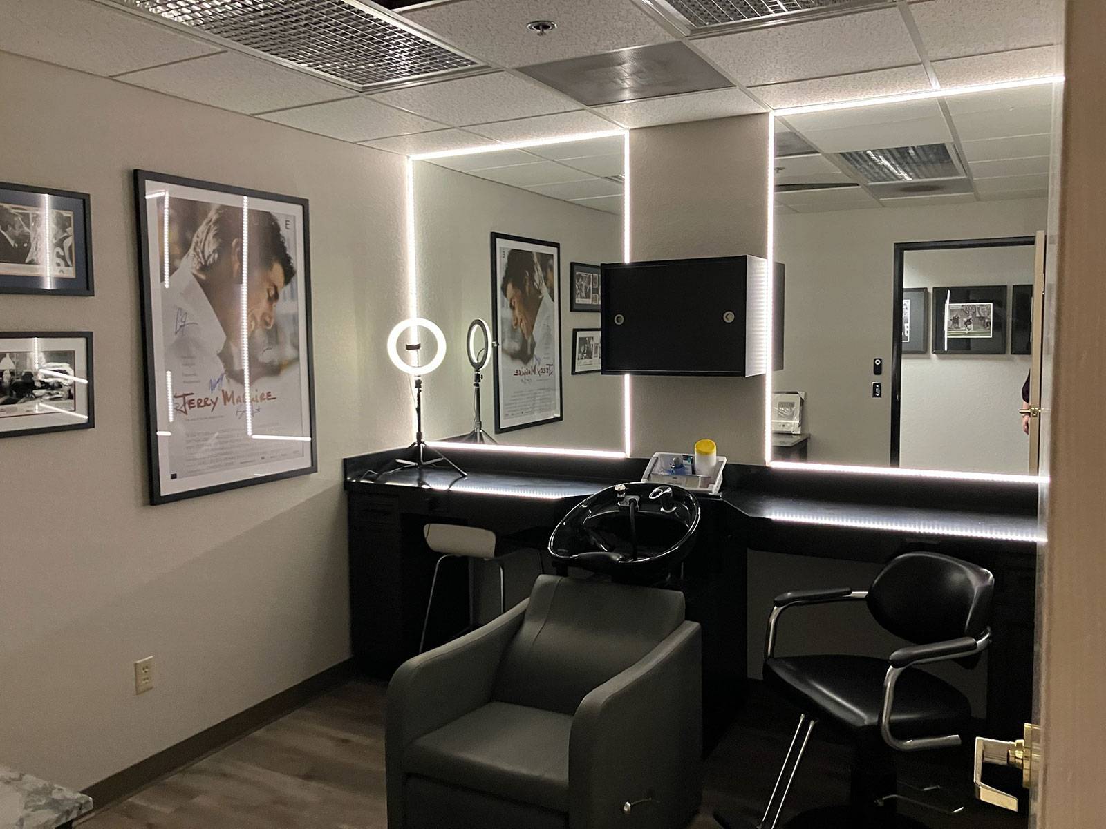 A professional hair washing basin alongside two separate make-up stations allows for preparing multiple talent simultaneously. Bright and adjustable lighting delivers a spectrum of different looks.